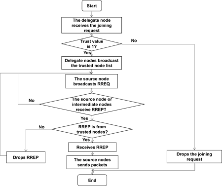 In solving the problem of black hole attack [9] , all legal nodes will send joining request with a trust value of 1 at the initial stage of the network. If the requesting node does not receive acknowledgement from the delegate node, it will stop sending joining request. Each node first verifies the node’s address before processing any request and then processes the request if the node is on the trust-list. When the delegate node receives the joining request, it will validate the trust value of the requesting node. If the trust value is matched, the requesting node is added to the trusted list and gets broadcasted in the network. The threshold for the joining request is set to 20 requests per second. Figure 1 shows the algorithm’s flow chart.