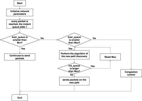 The congestion may occur when the average queue length is between the values of Min and Max, and the discovery mechanism for a secure path is initiated. When the instant queue is larger than Max, the value of Max should be reset because of the wrong selected path. If the average queue length is larger than Max, the nodes are in the congestion status and the congestion control is carried out. The flow chart of the algorithm is shown in Figure 3.