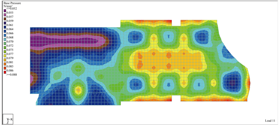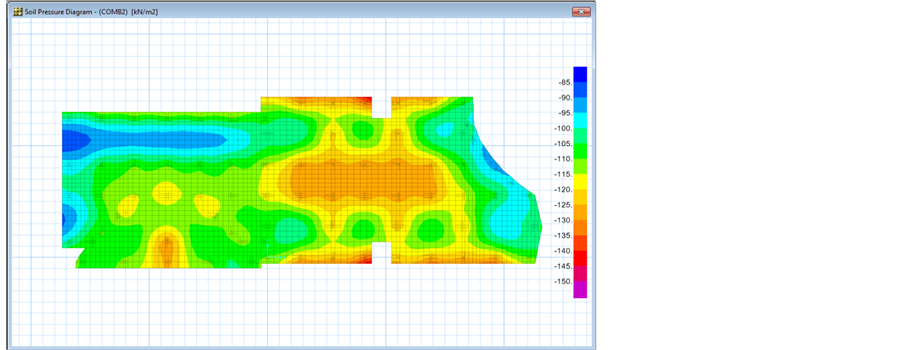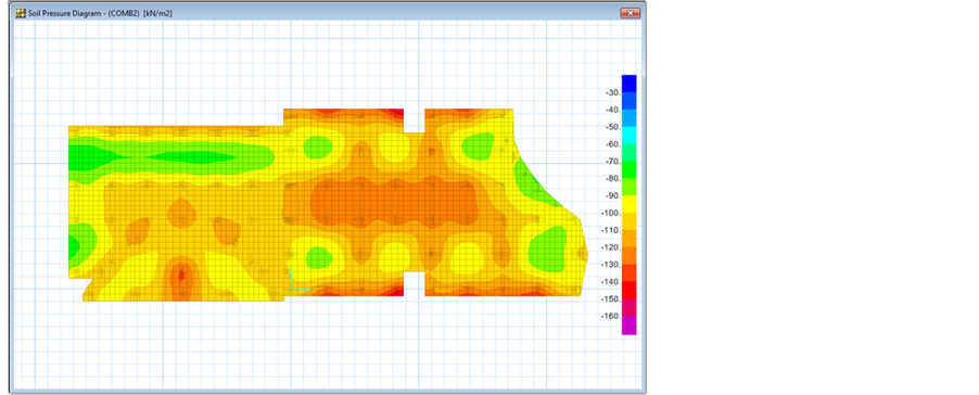 To find the best suitable foundation design to be used in Iraq and the differences when using the American and European codes, a Building model was designed and analyzed using STAAD Pro., and SAFE softwares for three locations (Mosul, Baghdad and Basrah). The combination loads used in the two softwares were for ACI and EC codes. The design of the building and foundation was done according to ACI and EC in the both softwares. The bearing capacities used in the softwares were obtained from field and laboratory tests done in three locations (Mosul southern, Baghdad in middle and Basrah in southern) of Iraq [41] . Results obtained from the two softwares are shown in Table 8. Figures 6-9 show the bearing pressure distribution under the foundation for Baghdad location as an example.