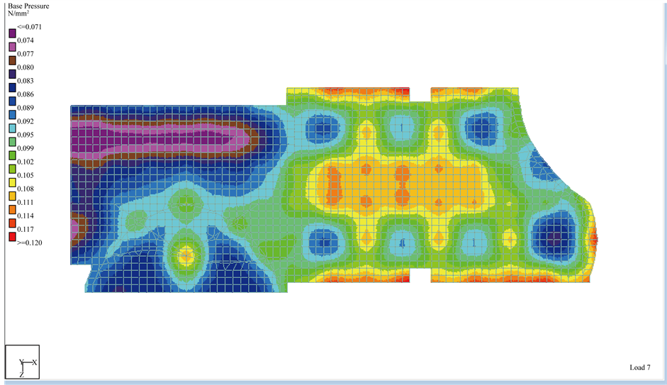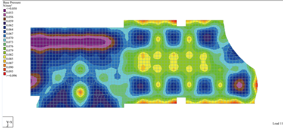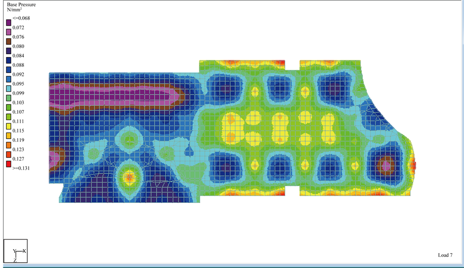 Figure 9. Bearing pressure distribution for worst bearing capacity value from STAAD Pro. software for ACI and EC codes.