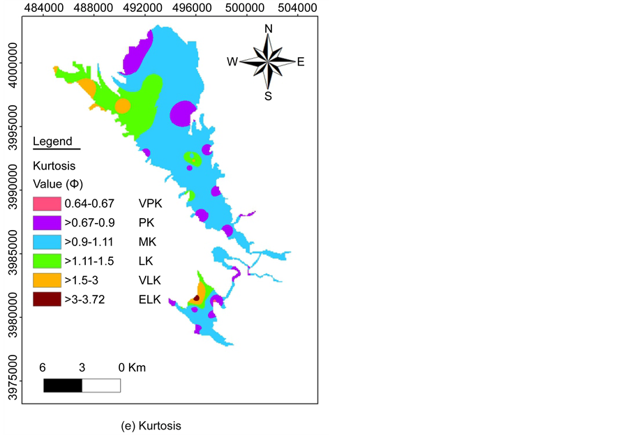 servoir (Figure 11(c)). This might be due to wave actions, variations in the water flow speed and rate and duration of deposition. The skewness statistical values indicate that strongly coarse skewed (SCS) and coarse skewed (CS) sediments represent (54.8%) of the total deposited sediments on the reservoir bottom surface. These negatively skewed sediments (fine materials) are mostly distributed in the NW part of the reservoir near to the entrance of the Hizop stream and also in the central, lower parts of it (Figure 11(d)). The near symmetrical (NS) sediments are (29%) of the total sediments and distributed in the upper most NE part of the reservoir near to the entrance of the Lesser Zab River and also in the lower part near to the dam site with a big patch in the triangle-shaped bigger reservoir. The calculated kurtosis statistical parameter shows that, among the deposited sediments on the Dukan Dam Reservoir bottom surface, the platykurtic sediments are the most dominant (45.1%) but the extremely lepokurtic sediments are the least distributed (3.2%). The mesokurtic sediments represent (32.2%), whilst, each of the very platykurtic, lepokurtic and very lepokurtic sediments forms (6.5%) of the total deposited sediments in the reservoir. The platykurtic sediments are distributed as patches near to the shore lines and the very lepokurtic and lepokurtic sediments are mostly seen in the NW part of the bigger triangle-shaped sub-reservoir near to the entrance of the Hizop stream to the reservoir and the northern part of the smaller irregular-shaped sub-reservoir (Figure 11(e)). The mesokurtic sediments are most dominant in the area where the Lesser Zab River enters the reservoir (Figure 11(e)).