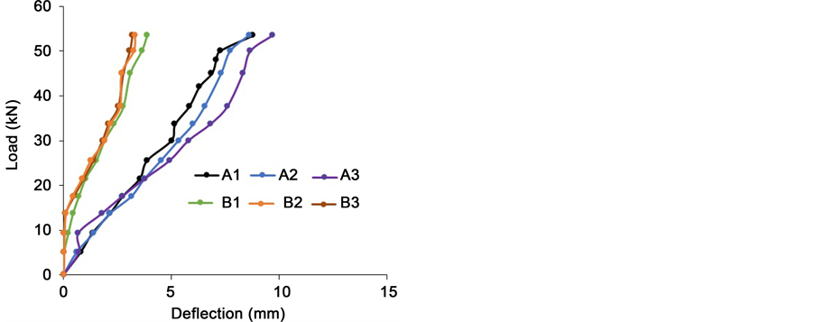 Figure 5 shows the load deflection curves of RBC beams belonging to groups A and B. As expected, the beams with more ratio of reinforcement (group B) showed less deflection as compared to that of the beams reinforced with lesser ratio of reinforcement (group A). The results show that mid span deflection of RBC beams was reduced to 2.5 times by increasing 50% area of steel.