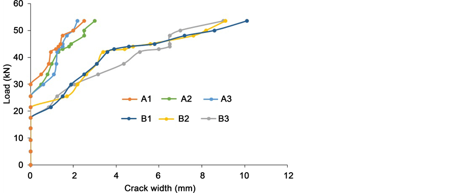 Figure 6. Load versus crack width response of RBC beams of group A (each consisting of two 12.7 mm diameter steel bars) and group B (each consisting of two 16 mm diameter steel bars).