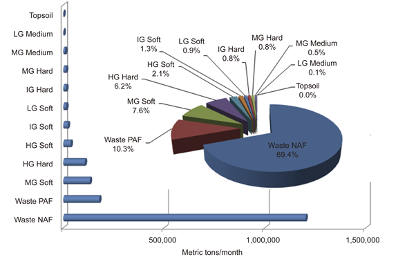 Figure 1 presents the monthly average tonnage for different types of materials generated an hauled from the open-pit mine. The waste rock fraction based on loading data was estimated to be about 81% the rest being other waste materials or estimated total material to waste ratio of 1.25:1, which agrees well with literature data for most mineral types [6] . Comparing the amounts of Waste NAF and Waste PAF and other materials transported in the three-month period (August-October), that is, 3.356, 0.892 and 1.011 million tons, respectively, the fraction of waste material or dilution factor was estimated to be 79.3%, or a ratio of
