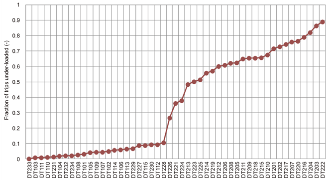 By cross-tabulating the tonnage hauled per trip versus the truck codes from Table 2 from monthly dispatch data, it was established that all trucks could carry 33 t per trip as a maximum load observed in this study based on dispatch logs. This data could also be obtained from manufacturers’ datasheets. It was further observed that the percent of dispatch frequency during which the trucks were loaded at33 t of the materials from the open pit mine was higher than 0% for all trucks, which indicates that all trucks could carry 33 t. However, dispatch frequencies with trucks loaded below 33 t were as high as 89%, signifying under-utilization of the trucks. Figure 2 shows the fraction of trips for which the trucks were under loaded (f < 100%). While some trucks were highly under-loaded (f < 10%) for most of the trips, only 9 trucks (or 18.4%) were loaded from 70% to 90%. Figure 2 shows also that all trucks were under-loaded from time to time, with large number of them (22 trucks or 43%) being severely under-loaded (f < 10%).