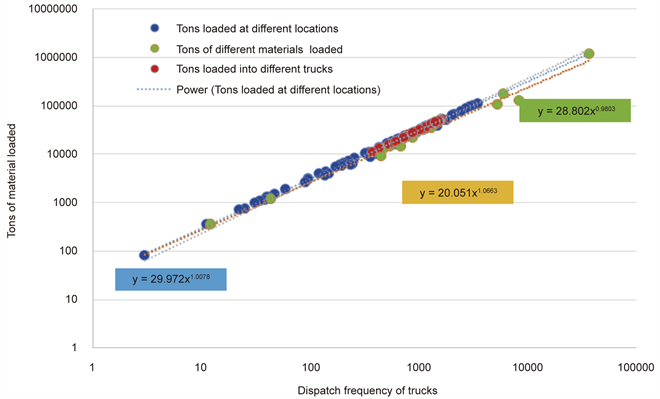 Figure 3 shows the variation of the dispatch frequency with tonnage of materials transported by each truck during one month. A linear relationship shows that the higher the dispatch frequency, the higher the tonnage of materials transported, as expected. However, the linear regression line with R2 = 0.9942 (<1.0) indicates that there are cases of dispatch where the trucks are loaded at lower fill-factor, which complements the results presented in Figure 2. The slope of 34.2, higher than 33.0 indicates that there were large number of cases where the fill-factor was higher. Thus, the truck-excavator system was being underutilized by loading the trucks below their respective pay load.