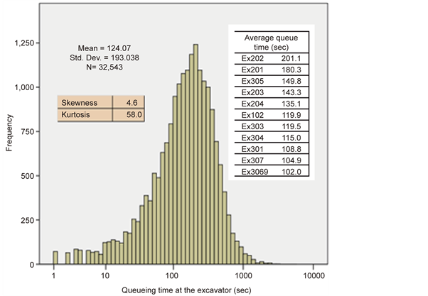 In open-pit mining operations, material haulage trucks form queues on arrival at excavators, crushers, and dump locations and have to wait their turn in line [13] [32] . This study focuses on queues formed at the excavator prior to loading. When representing loading operations with queuing systems, the time a truck spends positioning and spotting at the excavator can be included either as part of the loading cycle time or as part of the time the truck was waiting in the queue for service. In this study, the latter queueing time was assessed. The data comprised of two parts, one with no queuing time at all during which the trucks were loaded after completing the empty haul (40.5% of the time) and another part with varying queuing time (59.5% of the time).