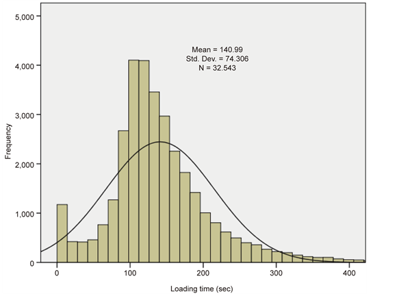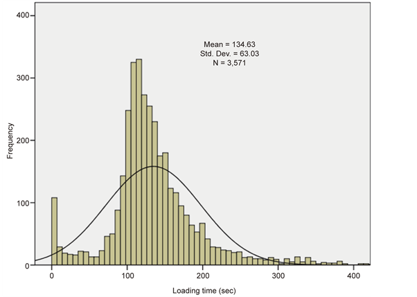 Loading times depend on excavator capacity, digging conditions and the truck bucket design and capacity. Queues often form at the excavators since many tracks of various sizes are used at individual excavators, making allocation of trucks to the excavators and pits to become a complex engineering problem. The stochasticity of loading times, portrayed in Figure 6 can also be attributed to the difference in loading techniques associated with each type of loading unit, location design, orientation of trucks versus the excavator, and loading area cleanliness and elevation. The loading techniques depend on whether an hydraulic excavator, hydraulic/electric excavator, rope-shovel, front-end loader, etc., is used. Together with damage to the trucks, overloading the trucks leads to extended loading time.