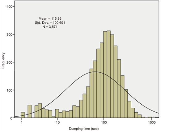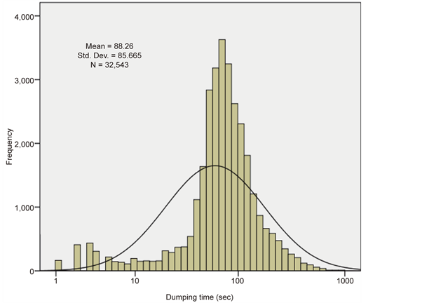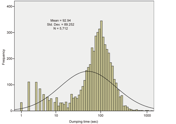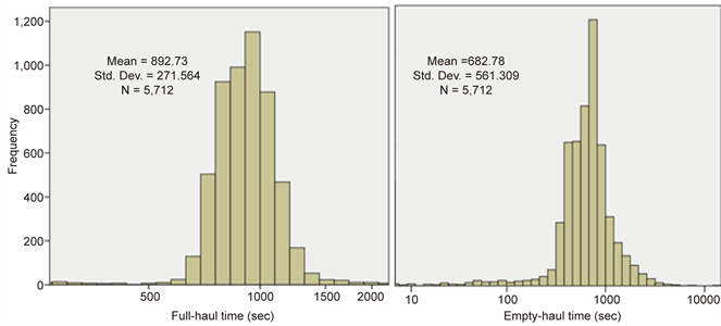Figure 8 shows the PDFs for full-haul times for trucks loaded with fixed tonnage (33 t) of waste NAF and also for the empty-haul data (which have no correlation to tonnage loaded or dumped). Both PDFs are logarithmic in nature, and depend on truck characteristics and driver behavior. Considering all trucks loaded with fixed material type at the same tonnage (Waste PAF, 30 t), the average full- haul cycle time was observed to be 892.7 seconds, while the average empty-haul cycle time was 682.8 seconds. The empty-haul cycle time data was analyzed after dumping, so that the results are not related to the tonnage and material type hauled before dumping.