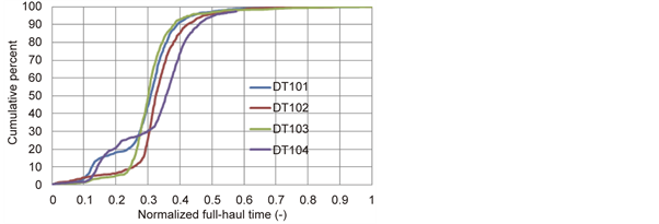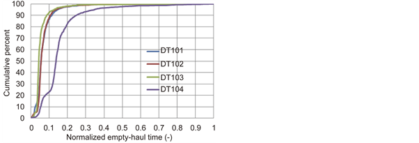 Figure 9 shows the cumulative functions of the normalized full- and empty-haul cycle time data for different trucks. Comparing the normalized full-haul cycle time data for the four selected trucks, it is evident that there is a marked difference in terms of median values, for instance, reached at increasing cycle time in the order of DT103, DT101, DT102 and DT104. The cumulative function gives a measure for differentiating performance between different trucks, which could not be easily deduced from the PDFs. On the other hand, the empty haul times show similar order of performance using median values. The fact that the empty-haul is shorter than the full-haul time is portrayed by short time to reach median (50%) for the former than the latter times.