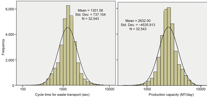 The total cycle time for materials transport process, Tct, varied by trucks and location (or haul distances) when the same material was loaded and hauled at the same tonnage between excavators and dumpsites. The average value of Tct was about 1,301 seconds corresponding to an average production capacity, Pcp, of 2,632 t/day for hauling 33 t of Waste NAF. The PDFs of Tct and Pcp data were also logarithmic.