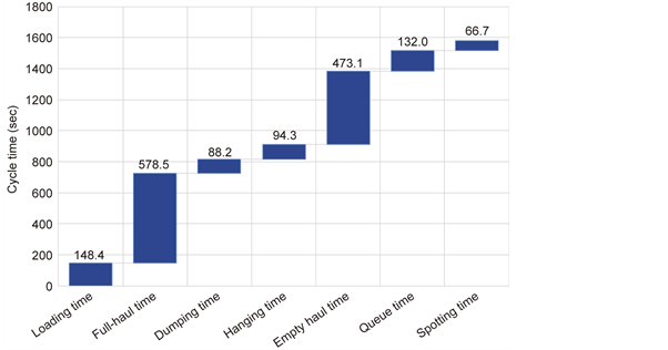 the same tonnage of 33 t. Full haul time was observed to be the longest among the seven components (as expected when such a large quantity of material being hauled) that is, 578.5 seconds, followed by empty haul time with average of 473.1 seconds. Due to large number of trucks being loaded by a small number of excavators, trucks took longer times waiting to be loaded leading to queue time of 132.0 seconds on average. The hanging time after dumping the waste materials took 94.3 seconds on average, with the shortest time being the spotting time which took 66.7 seconds on average. In terms of percent of total cycle time, the full haul was about 44.5%, while empty-haul was about 36.4%
