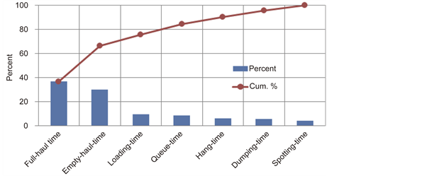 Figure 14 shows the Pareto chart for the cycle time components during Waste NAF transportation. Results show that the three most critical components or bottlenecks of the waste transportation system were identified as full-haul (44.5%), empty-haul (36.4%) and loading processe (11.4%), which forms mine operation KPIs. Thus, cycle time reduction should focus at these three components which can be reduced by managing drivers’ behavior, good haul road design and improved drilling and blasting efficiency to allow faster loading.