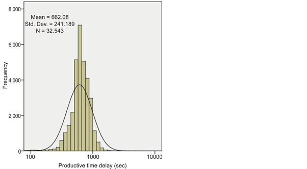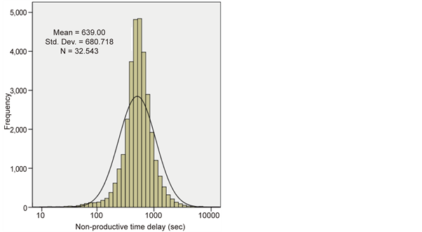 Table 4 summarizes the analysis of PDF types of the cycle time components observed in this study. It can be seen from Table 4 that the PDFs for loading process were different in nature from those of the rest of the seven steps of material transportation cycle. This can be attributed to the fact that this step involves a different machine and different driver from the truck (that is, the excavator), operations and characteristics of which differ from the truck. Together with data presented in Table 4, further analysis revealed that the PDFs of total cycle time, production capacity, productive time delay, non-productive time fraction and cycle time performance ratio were logarithmic in nature while the productive time fraction data gives a linear PDF.