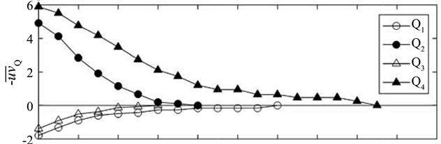 For the current case, the maximum velocity is shifted towards the rough surface ( ) (see Figure 5), similar to the results of [24] . The localized roughness aberrations produce flow alterations of significant magnitude, which becomes representative for the flow close to the rough surface when applying spatial averaging. Similar local velocity alterations, for flow over a gravel bed, were reported by [19] . From Figure 5, a note can also be dedicated to the spatial heterogeneity of the flow. The measured planes are positioned with a lateral distance of only 40 mm between them yet the position of the maximum velocity differs substantially, as the maximum of the double averaged velocity is positioned closer to the center of the channel for the upper plane ( ). The size of the roughness elements differs no more than 3% between the planes but the standard deviation of the roughness elements is significantly higher in the upper plane. Quadrant analysis is a method to disclose the instantaneous point-contribution of the velocity fluctuations to the Reynolds stress in relation to a defined quantity H, defined as