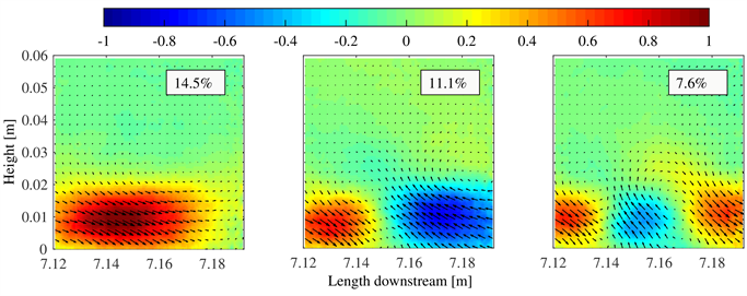 The scale in Figure 8 is between −1 and 1, where 1 corresponds to the maximum energy captured within the mode. The first mode represents the flow structures containing the most energy, which also represents the flow structures rendering the peak in the integral length scale (Figure 7).