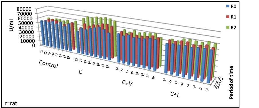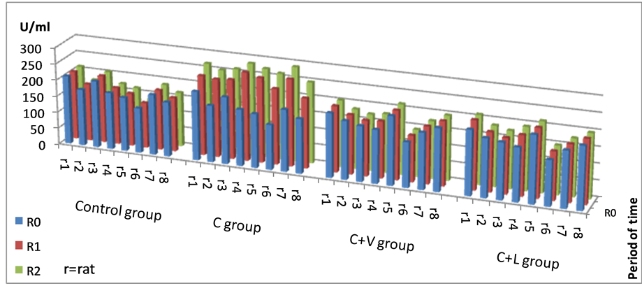 The experimental study was designed over a period of 60 days. We used adult Wistar male rats, 250 - 280 g weight range, provided by animal research division of the University of Medicine and Pharmacy, “Gr. T. Popa” Iasi. During the experiment the guide’s instructions on care and use of animals for scientific purposes were followed [9] . Rats were distributed into 4 groups, 8 rats each, fed as per the following: group I—control standard diet, group II—cholesterol 0.4 g/kgc/day (C), group III—cholesterol 0.4 g/kgc/day and valine 62.5 mg/kgc/day (C + V), group IV—cholesterol 0.4 g/kgc/day and leucine 69.985 mg/kgc/day (C + L). At the beginning of the experiment (R0), after 30 days (R1) and at the end of the experiment (R3), we collected blood samples from retro-orbitary plexus of each animal in order to determine the blood levels of SOD and GPx activities.