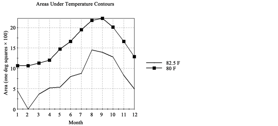 In Figure 1, taken directly from the 12 charts of the western Pacific of H. O. 225 [two of which are reproduced in Figure 4 and Figure 5], is displayed the area between the equator and the 82.5 F contour and the area between the equator and the 80 F contour as functions of month in the western North Pacific. Counting of the