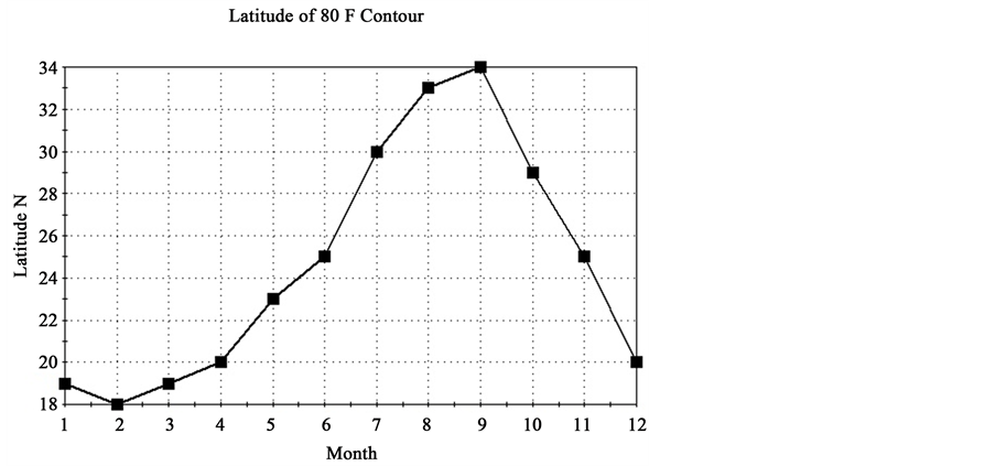 When the areas in Figure 1 increase or decrease, they do so mainly by the contours moving north or south (Figure 2 shows this for the 80 F contour). In all cases the longitude of the maximum latitude of the 80 F contour, used in the construction of Figure 2, was located well out in the open ocean and not immediately off the western boundary (longitudes of the maximum range from 130 to 160 E). Gently curving temperature contours produce large-scale longitudinal maxima. [Where the 82.5 F contour crosses the equator (not shown) ranges from 162 W to 167 E but with no apparent systematic seasonal variation.]