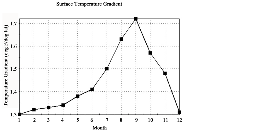 Consider briefly the northward gradient of sea surface temperature in the North Pacific, which is set up and maintained by the sun. An estimate of the mean northward SST gradient is given in Figure 3 as a function of month based on H. O. 225. Differences in surface temperature were taken between that of the 80 F contour and an average of that at the Aleutian Island chain, and differences in latitude were taken between the maximum latitude of the 80 F contour and the average latitude of the Aleutian Island chain. Then the ratios of the temperature differences to the latitude differences were computed and given in the figure in units of degrees F per degree of latitude. What is to be noticed at a quick glance in Figure 3 is the gradual rise in the magnitude of the gradient between January and September, followed by a quicker decline. The gradient maintains the same sign