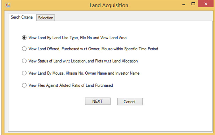 Custom forms are developed to show the implementation of all 3 branches. These forms open from ArcMap 10.2. Each form has Search Criteria and Selection tabs. First and second tab shows the logical grouping of queries and searching filters of selected query (from first tab) respectively. Figure 5 shows the logical groups of land acquisition branch’s queries.