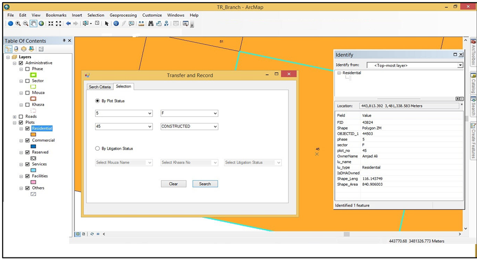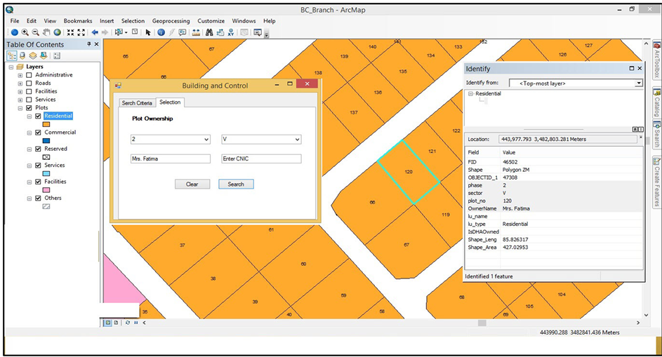 Two different tools are used to show the results of prebuilt queries on an appropriate layer. These tools are branch wise “Custom Add-In” and “Identify”. In this study, Custom Tool is the substitute of the Arc Map default “Select by Attributes” Tool. Select by Attributes tool is complex to use for any non-GIS user as it requires expertise in Structure Query Language (SQL) to develop your own custom query for the selection of feature(s). Further, In ArcMap 10.2, Identify tool is given by default and has flexibility to change or improve the tool as per condition. In this study, we don't need to develop custom Identify tool because default Identify is full filling the current study requirement and very easy to use by any non-GIS user. Select the tool from the 'Tools' toolbar and click on that feature which attribute user wants to view. Automatically a dialog box will be open in the center of the screen with all attached attributes. In Figures 7-9, it shows that “Identify” tool is used to identify the feature information and properties after the selection of feature using Add-In. The Add-In finds the feature (i.e. Plot, Khasre, Road, etc.) by bringing it to the center of the screen and changing its color, so that it appears different from the rest. In Figure 7, user wants to know the plot number on the basis of owner name in Building and Control branch. After the selection of “search criteria” user control move to “Selection” tab by pressing next button. On “Selection” user selects the search filter(s) and press search button. Plot no 120 is highlighted. Then user opens the built-in “Identify” tool and click on the highlighted plot. All properties that are attached to the layer are displayed on the screen for further decisions.
