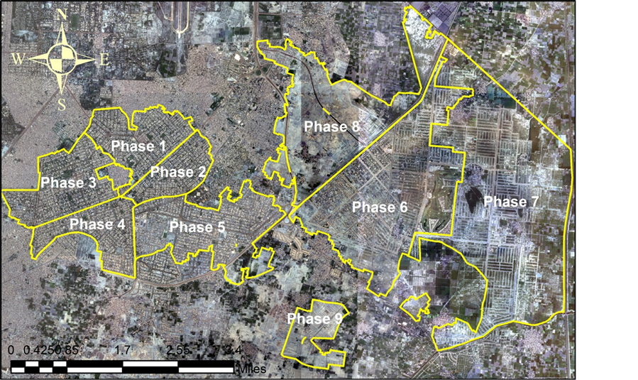 The Study area includes area administrated by DHA and within the adjacent phase, which is around 116.5 Sq km. Out of this around 64Sq Km is administrated by DHA from Phase 1 - 9 (see Figure 1). The areas which lie on the periphery of DHA Phases along with the area that lie within the surrounding areas of DHA boundary also be included in this study scope with only major areas and localities parcels and Roads network. Both developed and under developed urban areas Phases from 1 - 9 define the boundary demarcations of the Project Area.