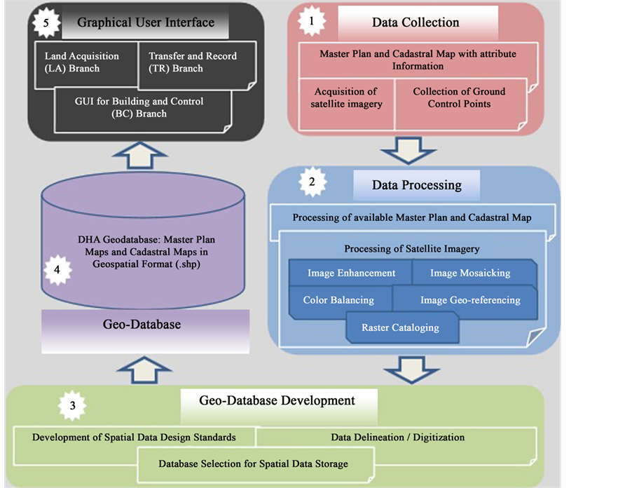This paper presents a systematic view of most up-to-date tools, technologies and techniques which is appropriate not only for effective decision making, but also helpful for competent administration to provide efficient resolution for spatial troubles of Khasra and Parcel management. Different Data collection techniques have been applied on different data sources. Worldview II of 0.5 resolution image, scanned Master Plan and Cadastral/Khasra Maps was used for development of geodatabase for spatial and non-spatial entities using ArcGIS 10.2. Multiple processing on Satellite Imagery using ERDAS Imagine was performed like Image enhancement, Mosaicking and Color Balancing, Image Geo-referencing and Raster Cataloging. Development of Customize Graphical User Interface (GUI) for DHA’s officials and administrator makes efficient decision in society matters. This is the first spatial GUI, for DHA to plan and maintain society’s activities efficiently, in the form of ArcMap Add-Ins. These Add-Ins are written in C#.Net using ArcObjects APIs within MSVS 2012.