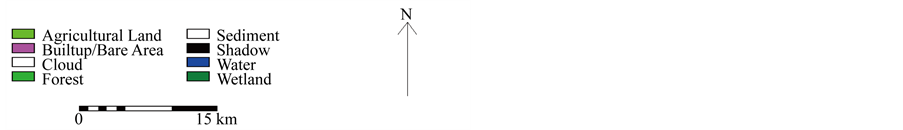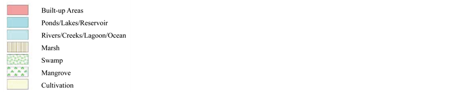 Since there are already in existence reputable classification systems, such as those listed above, it would be meaningless to develop a system that would be useful only for the purpose of this research. The commonly used US Geological Survey Land-Use/Land Cover Classification System [14] was thus modified for the preparation of the legend for the LULC maps. Since 30 m resolution images were used for the classification, the following 6 land use/land cover classes were derived; built-up/bare area, agricultural land, forest, wetland, water and sediments.