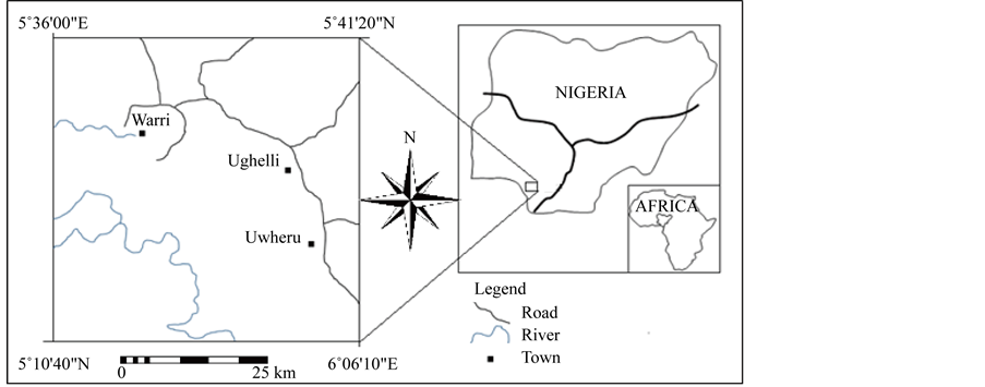The area of interest lies within latitudes 5˚10'39"N - 5˚41'19"N and longitudes 5˚35'59"E - 6˚06'09"E and is contained in the triangle of Niger Delta region of Nigeria (Figure 1). Its geology is the product of both fluviatile and marine sediment build-up during the upper Cretaceous. Three major depositional cycles have occurred in the region leading to the deposition of the Akata, Agbada, and Benin Formation. The Agbada Formation is rich in hydrocarbon. The relief is low lying and built on the successive sedimentation of four physiographic units - fresh water swamp, mangrove swamp, coastal plains and the upland Niger valley. Soils are generally hydromorphic and poorly drained. The pristine vegetation has been reduced considerably in the area and replaced by mosaic of secondary re-growth such as arable farmlands (cassava, maize, yam) and tree crops (oil palm, rubber,
