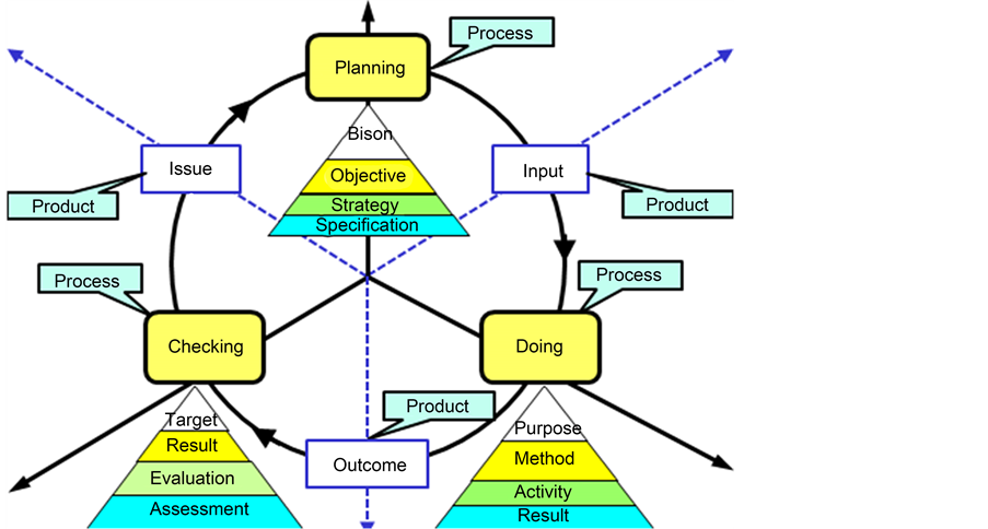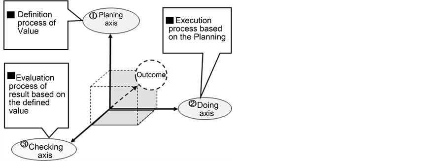 In this model, three kinds of target entities of management process such as “Planning, Doing and Checking” are defined for the process quality assessment of organizations. These three axes are corresponds to the process of “CPD” cycle shown in Figure 1. Also, these three kinds of viewpoint correspond to the three axes of process as shown in Figure 4 and are correspond to the three characteristics of system product such as the “Value, Performance and Adaptability” for the assessment of product quality management of organizations as shown in previous paper [9] .