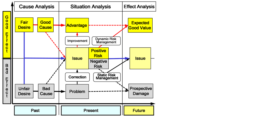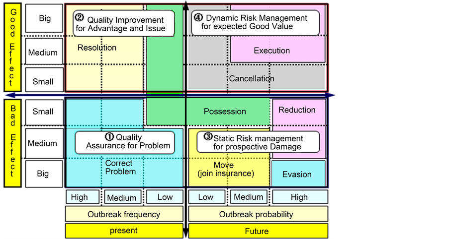 “Dynamic Risk Management” is performed in order to take “Expected Good Value” in future. Therefore, this domain is synonyms as investment management or Project risk management [11] . The “Positive Risk” may cause “Expected Good Value” by an influenced from improvement of “Advantage” and “Issue” of “Product or Process” at the present. “Positive Risk” is defined by the “probability and scale” of “Expected Good Value” or “Prospective Damage” when performing “Dynamic Risk Management”.