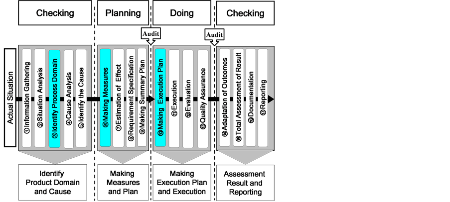 On the other hand, for a high quality evaluation of the organizational management, TQM (Total Quality Management) [1] is used all over the world and is recognized. However, it is very difficult to establish all management scope of the TQM. Furthermore, the aim of TQM must cover both “Product and Process” based on the consideration of the basic concept of Quality Control. On the other hand, we have been working on the development of ISO/IEC25000 (SQuaRE) series of standards for quality requirements and evaluation of the system and software product [2] [3] [4] [5] for a long time in ISO/IEC JTC1 (Joint Technical Committee 1 of the International Organization for Standardization and the International Electro technical Commission) SC7WG 6 (software and systems engineering). As part of this project, we have worked on the developments of ISO/IEC25030 [3] , 25040 [4] , 25041 [5] , which are the standards to provide supporting technique of method for quantitative quality requirement definitions and evaluation of software and system product. And, quantitative quality requirement and evaluation of system are executed from the view point of system and software product quality models defined in ISO/IEC9126-1 [2] (ISO/IEC9126-1 has revised by ISO/IEC25010:2011). On the other hand, the definition of system is a combination of interacting elements organized to achieve one or more stated purposes defined in ISO/IEC15288:2008 Systems and software engineering-System life cycle processes [6] . Therefore, an organization with specific purpose is regarded as a kind of system based on the definition of system of ISO/IEC15288. Based on the above assumptions, previous study [7] , we suggested the General framework of “new TQM” based on the concept of “system quality requirement and evaluation process” of ISO/IEC 25040 [4] and the original concept of “TQM Matrix” [7] . On the other hand, previous study [8] , we suggested the “Three Dimensional Unification Value Model for Product evaluation based on the consideration of enlarging system product quality model in ISO/IEC9126-1 [2] . Therefore, previous study [9] , we suggested the “Target Entities of Total Quality Management” for organization based on the “new TQM” and “Three Dimensional Unification Value Models”. Furthermore, previous study [10] , we suggested the “Common Management Process Model” based on the consideration of “TQM Matrix” and “Three Dimensional Unification Value Models”. Therefore, in this article, we suggest the “Common Management Process Model” of organization based on the consideration of situation analysis as shown in Figure 5 and more precise definition of new TQM for “Product and Process [9] ” as shown in Table 1. Furthermore, we report the result of confirmation of the application possibility of the “Common Management Process Model” for the four domains of “new TQM”. In this paper, background of this research in clause 1, concept of new TQM in clause 2, concept of the Common Management Process Models in clause 3, verification result of the application possibility of common management process in clause 4, conclusion described in clause 5.