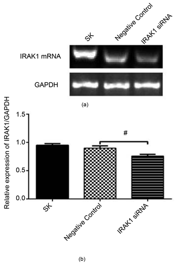 Figure 1. (a) RT-PCR assay was used to detect the expression of IRAK1 mRNA in SK-Hep1 cells transfected with IRAK1siRNA; (b) Compared with blank siRNA group, the expression of IRAK1 mRNA decreased significantly after successful transfection (#: P < 0.05).