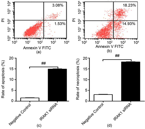 Figure 2. Apoptosis and necroptosis rate of SK-Hep1 cells transfected with IRAK1siRNA were detected by flow cytometry. (a) The apoptotic rate of transfected blank siRNA group was 1.53%, necroptotic rate was 3.08%; (b) The apoptotic rate of transfected IRAK1siRNA group was 14.93%, necroptotic rate was 18.23%; (c) The apoptotic rate of transfected IRAK1siRNAgroup was significantly higher than that of transfected blank siRNA group; (d) the necroptotic rate of transfected IRAK1siRNA group was significantly higher than that of transfected blank siRNA group. (##: P < 0.01).