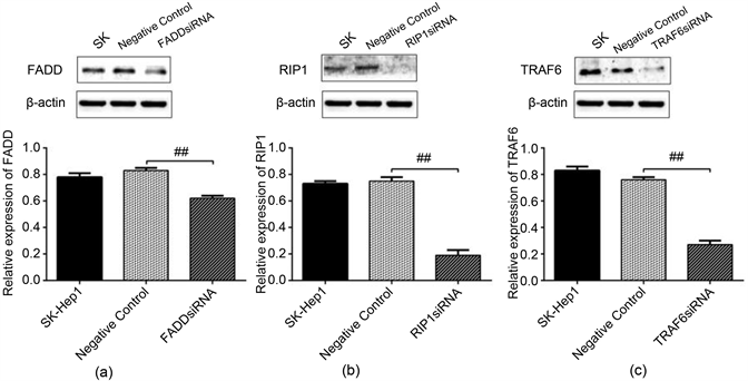 Figure 3. Western blot was used to detect gene silencing after transfection with FADD, RIP1 and TRAF6. (a) After transfection of FADDsiRNA, the expression of FADD protein was significantly weaker than that of the blank group; (b) After transfection of RIP1siRNA, the expression of RIP1 protein was significantly weaker than that of the blank group; (c) After transfection of TRAF6siRNA, the expression of TRAF6 protein was significantly weaker than that of the blank group. (##: P < 0.01).