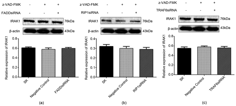 Figure 5. The expression of IRAK1 protein was detected by Western blot. (a) There was no significant change in the expression of IRAK1 protein after FADD silenced under z-VAD-FMK intervention; (b) There was no significant change in the expression of IRAK1 protein after RIP silenced under z-VAD-FMK intervention; (c) There was no significant change in the expression of IRAK1 protein after TRAF6 silenced under z-VAD-FMK intervention. (P > 0.05).