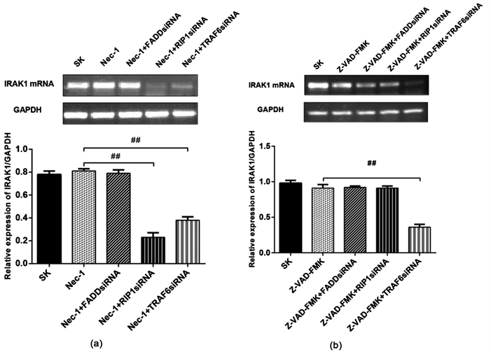 Figure 6. The expression of IRAK1 mRNA was detected by RT-PCR. (a) After RIP1 and TRAF6 were silenced under Nec-1intervention, the expression of IRAK1 mRNA was significantly decreased compared with the control group, while the expression of IRAK1 mRNA was not changed under FADD silenced; (b) After TRAF6 were silenced under z-VAD-FMK intervention, the expression of IRAK1 mRNA was significantly decreased compared with the control group, while the expression of IRAK1 mRNA was not changed under FADD and RIP1 silenced respectively. (##: P < 0.01).