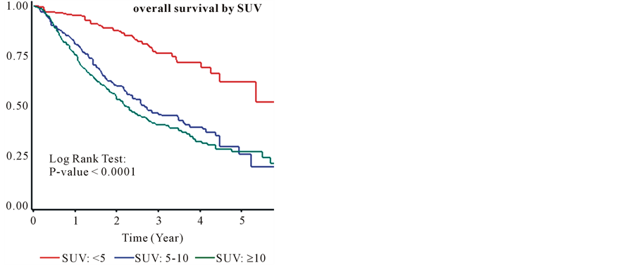 To better understand the potential contribution of SUV to determine prognosis, we reviewed the records of patients with NSCLC after PET-CT imaging. Data were analyzed to determine whether SUV predicted the overall survival, recurrence rate, the likelihood of lymph node involvement and if so, whether SUV was an independent prognostic factor for survival from components of pathologic tumor node-metastasis system staging.
