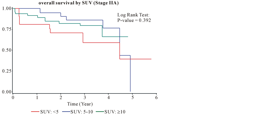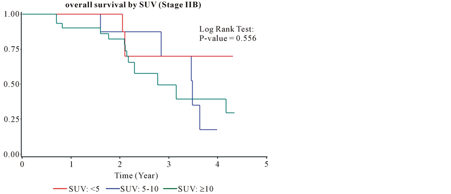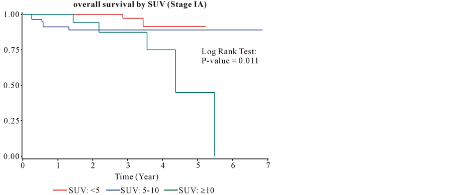 Previous studies have correlated FDG uptake in primary tumor correlates with poor survival. Most of these studies were based on comparisons of survival between groups of patients with high and low SUV values, defined by applying cut-offs for SUV ranging from 5 to 20 [9] [17] [19] - [30] . There is apparently no true cut-offs point for SUV, but rather a transition zone in which the prognosis gradually worsens. A systematic review done by Nair et al. concluded that increasing tumor FDG uptake is associated with worse survival in patients with stage I NSCLC [31] .