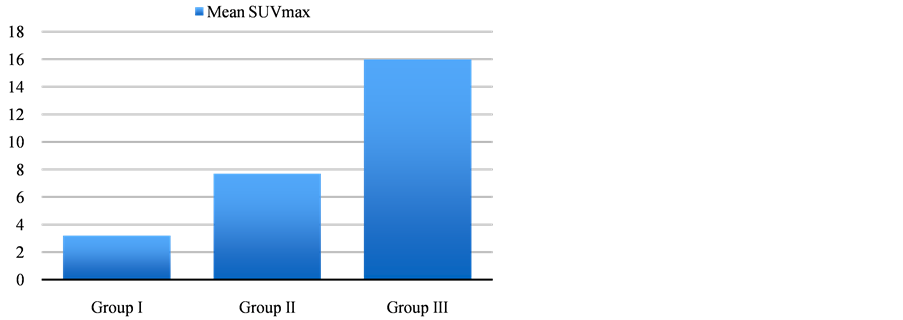 Our results show that there is a significant correlation between the tumor size and the SUVmax value. Lower levels of SUVmax are associated with smaller primary lung tumors. It was also shown that the minority of patients with lower levels of SUVmax (group I) have advanced stage IV lung cancer (only 4%) compared to the majority of early stage I lung cancer (73%). The rate of ipsilateral and contralateral mediastinal lymph nodes metastasis (N2, N3) was significantly higher in patients with higher levels of SUVmax. Cerfolio et al. have shown in there study that the SUVmax of NSCLC is positively correlated to the T status, N status, and M status and is an independent predictor of stage. They stated that SUVmax might even be a better guide than the clinical stage [17] .