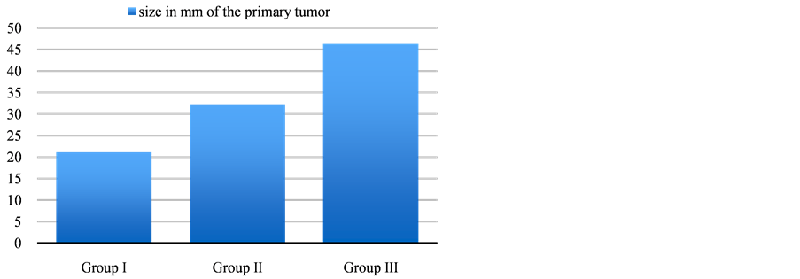 groups (34% - 36%) followed by the left upper lobe (23% - 34%). The least common tumor location among all the groups was the right middle lobe (2% - 6%). Upon examination of the primary tumour, the mean SUVmax in group I was 2.2; group II was 6.8; and group III was 15.9. There was a significant difference in the mean tumor size of the primary lung lesion among all the groups, were the mean tumor size (Figure 3) of group I was 21.9 mm compared to group II 32.3 mm and group III 46.3 mm (p-value < 0.0001).