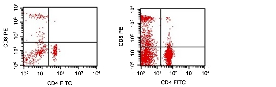 Figure 1.Show dot blot analysis of flow cytometry data of CD4/CD8 of two cases revealed. (a) A case with T-helper (16%) (768 cell/µl) and T-cytotoxic (10%) (480 cell/µl) with low absolute count; (b) A case with T-helper (42.9%) (4804.8 cell/µl) and T-cytotoxic (23.6%) (2643.2 cell/µl) with high absolute count.