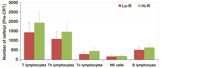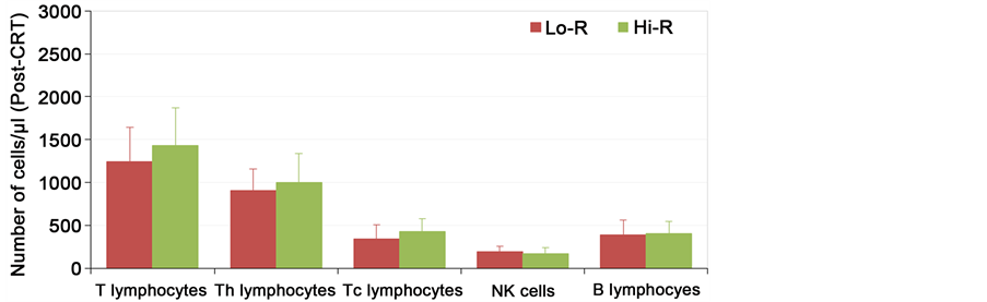 For pre chemoradiotherapy counts of TLC, ANC, peripheral lymphocyte count and counts of lymphocytes subsets (T lymphocytes, Th, Tc) all showed higher median values in patients with high regression rate (Hi-R) compared to low regression (Lo-R) group as shown in Figure 2(a). Figure 2(b) also showed the same trend when comparing high regression to low regression group; median values for post chemo radiotherapy lab all were higher in high responders (Table 3).
