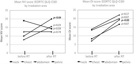 Concerning the influence of radiotherapy on the psychophysiological state, a study reported that there was a correlation between QOL/symptom deterioration and anxiety/depression [16] [17] . However, no study has examined palliative radiotherapy. In this study, overall, there were no significant changes in anxiety or depression after palliative radiotherapy. For palliative radiotherapy, an irradiation field is established so that the development of adverse effects may be minimized. In this study, there was no grade 2 or higher (CTCAE v4.0) adverse event in any subject, but “nausea/vomiting” and “diarrhea” significantly exacerbated after pelvic irradiation. In most patients undergoing pelvic irradiation, the lesion extent is more extensive than in thoracic or lumbar vertebral metastasis patients undergoing palliative radiotherapy; the irradiation volume tends to increase. In this study, there was no significant difference in the “nausea/vomiting” score at the completion of palliative radiotherapy between opioid-treated and non-opioid-treated patients. Therefore, the deterioration of “nausea/vomiting” after palliative radiotherapy may depend on the irradiation volume. In the future, it may be necessary to consider radiation doses to be prescribed, involving irradiation-field setting, for patients in whom the irradiation volume may increase, such as those with multiple or pelvic bone metastases.