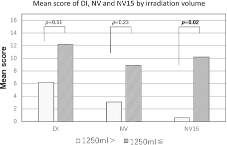 Figure 2. Mean score of DI, NV, NV15 in the irradiated field.