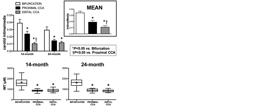 Figure 4. Intima-media ratio and intima-media thickness in carotid arteries of FH swine. Top left: I/M in the bifurcation, proximal and distal CCA of 14- and 24-month old FH pigs. Top right: Pooled I/M in each carotid segment from both groups. Bottom: Box plots of IMT in the three carotid segments of both age groups (box represents 25th and 75th percentile; whiskers, range; horizontal bar represents the mean. I/M and IMT were not significantly different with age. Each carotid segment I/M was different from each other (p < 0.001). CCA, common carotid artery; *p < 0.05 vs. bifurcation; †p < 0.05 vs. proximal CCA (14 months, n = 14; 24 months, n = 10). Values are means ± SE.