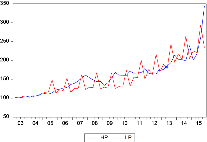 In this paper we choose “housing sales price index (HP)” and “land transaction price index (LP)” of Shenzhen as the research variables, The data comes from the “Chinese Statistical Yearbook”, “China Monthly Economic Indicators”, and “China urban land price Dynamic monitor website”. The sample space of this paper is from the first quarter of 2003 to the fourth quarter of 2015 with a total of 52 time series data. We fixed other data based on HP and LP of the first quarter of 2003. In order to eliminate the influence of abnormal data on the estimation accuracy of the model, the variable data are used in the form of logarithm. Take: