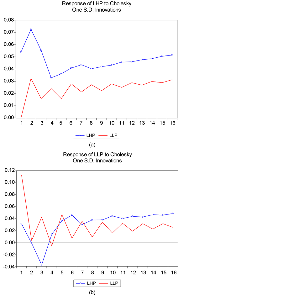 The impulse response results are shown in Figure 2(a) and Figure 2(b), the horizontal axis represents the tracking period of the impulse response function, the vertical axis represents response degree the explanatory variable had on the explained variable. Figure 2(a) reflects the dynamic response of housing price which was shocked by a standard deviation of endogenous variables: LHP immediately had a strong reflection after being hit by a standard deviation shock of its own, its price fluctuation increases 5.4 percent and rises rapidly, and reached the maximum value of 7.2 percent in the second period, then continued to decline, reaching a minimum of 3.3 percent in the fourth period, from the fifth phase it began to rise and remained increase. LHP did not respond in the first period after a standard deviation shock from LLP, in the second period it increased to 3.2 percent, then in the third period it dropped to 1.6 percent, and in the fourth period rose to 2.4 percent, after that it appeared seasonal fluctuation, and the fluctuate began to slow down after eight phase, the overall reflection intensity is lower than its own inertia.