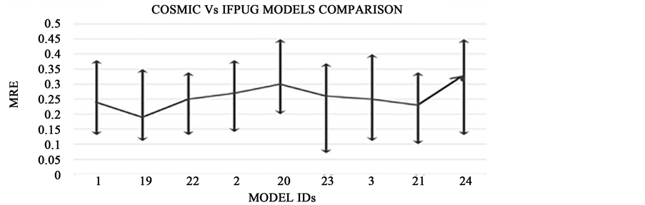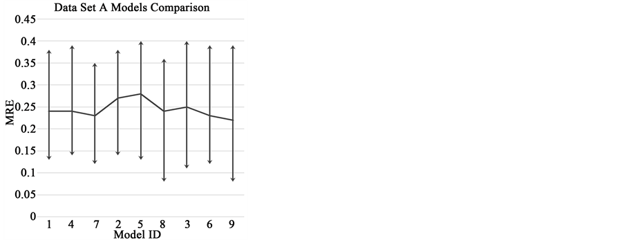 To compare the performance of models, MRE values for 50% and 25% of the population in addition to 75% were taken into consideration. Each vertical bar in the charts (Figures 3-7) depicts the MRE value for 50% in the middle with either extremes showing MRE values for 25% and 75% of the population for each of the identified model. The middle points of each bar (MRE for 50% of population) are connected by a line to visualize the difference between successive models. This point is referred simply as MRE in the following discussions and was used to compare the performance of the models.